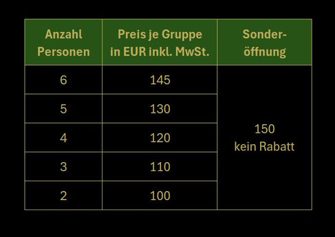Aus personellen Gründen sind je Spielzeit max. 2 Räume buchbar. Sollten Sie 3 oder 4 Räume parallel belegen wollen, bitten wir um eine E-Mail an info@house-of-mysteries.de oder um Ihren Anruf unter 07525 5079940 (Anrufbeantworter mit umgehendem Rückruf). Wir werden unser möglichstes unternehmen, um Ihrem Wunsch zu entsprechen.